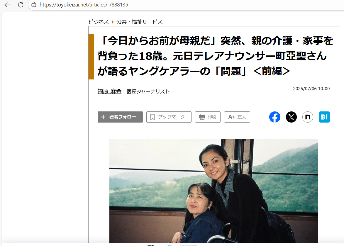 HOME BLOG Change of your life/人生を変える 「今日からお前が母親だ」突然、親の介護・家事を背負った18歳。元日テレアナウンサー町亞聖さんが語るヤングケアラーの「問題」<前編> 「今日からお前が母親だ」突然、親の介護・家事を背負った18歳。元日テレアナウンサー町亞聖さんが語るヤングケアラーの「問題」<前編> 2025.07.06 Tweet Share 「今日からお前が母親だ」突然、親の介護・家事を背負った18歳。元日テレアナウンサー町亞聖さんが語るヤングケアラーの「問題」<前編> 勉強や部活に時間を費やしたり、友たちと楽しい時間を過ごしたり……。10代の貴重な時間を親の介護や家事に奪われてしまう。そんな「ヤングケアラー」は中高生の17人に1人、つまり1クラスで1~2人にのぼる(*1)と… 言葉が出ない・話が理解できない…患者数50万人《失語症》脳卒中の後遺症で名前すら言えなかった男性(65)が"歌の力"で言葉を取り戻すまで 増え続けるビジネスケアラー。働きながら親の介護と家事を続け、24歳で家を購入した元日テレアナウンサー町亞聖さんが語る「後悔」<後編>